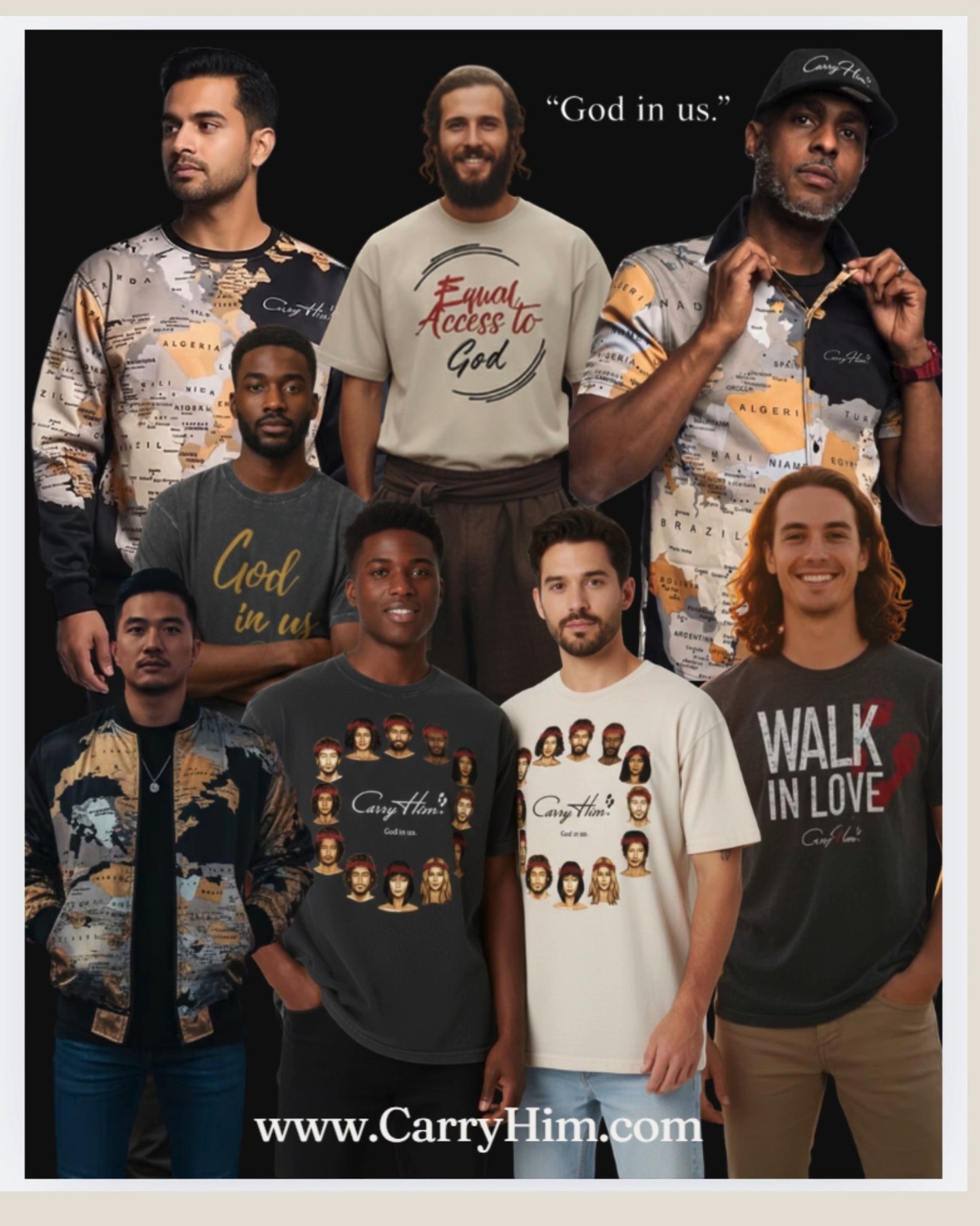 Carry Him creates inspiring, high-quality clothing that empowers individuals to express their faith confidently—promoting love, hope, and unity through every design.